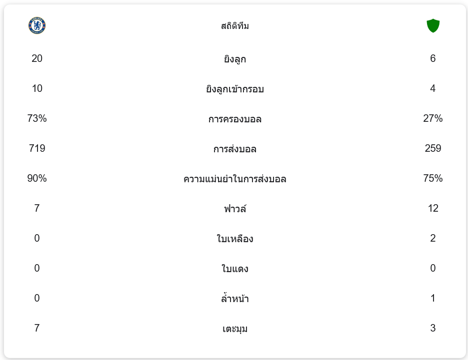 เชลซีครองบอลถึง 73% และจ่ายบอลสำเร็จ 719 ครั้ง ด้วยความแม่นยำถึง 90% ยิงทั้งหมด 20 ครั้ง เข้ากรอบ 10 ครั้ง ขณะที่แชมร็อค โรเวอร์ส ครองบอลเพียง 27% จ่ายบอลสำเร็จ 259 ครั้ง และยิงเข้ากรอบเพียง 4 ครั้ง