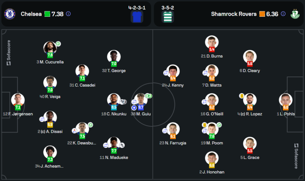 เชลซีใช้แผน 4-2-3-1 ที่เน้นเกมรุกจากแดนกลางและปีก โดย เอ็นคุนคู ทำหน้าที่เป็นหัวใจสำคัญในการสร้างสรรค์เกม ขณะที่กองหน้าอย่าง กูยู มีความคมและความเร็วในการจบสกอร์ ด้านแชมร็อค โรเวอร์ส ใช้แผน 3-5-2 เน้นการตั้งรับและสวนกลับเร็ว แต่ไม่สามารถต้านทานการบุกหนักของเชลซีได้