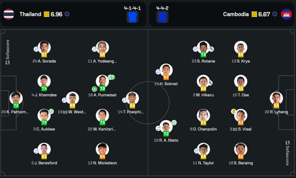 ไทย มาในแผน 4-1-4-1 เน้นการครองบอลและการบุกที่แม่นยำ อัครพงศ์ พุ่มวิเศษ และ วีระเทพ ป้อมพันธุ์ ทำหน้าที่คุมแดนกลางได้ยอดเยี่ยม แนวรับของไทยแสดงความเหนียวแน่นเมื่อเจอกับการบุกสวนกลับของกัมพูชา