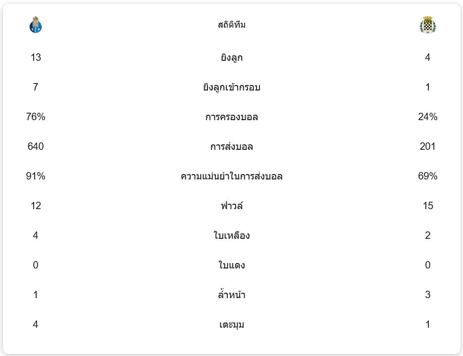 ปอร์โต้ครองบอลถึง 76% และส่งบอลสำเร็จ 640 ครั้ง เปรียบเทียบกับเบาวิสต้าที่ทำได้เพียง 201 ครั้ง การยิงเข้ากรอบ 7 ครั้งของปอร์โต้เปลี่ยนเป็น 4 ประตู สะท้อนให้เห็นถึงประสิทธิภาพในแนวรุกที่เหนือชั้น