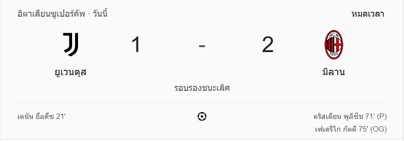 ยูเวนตุสพ่ายเอซี มิลาน 1-2 ศึกซูเปอร์โคปปาอิตาเลียนา รอบรองฯ