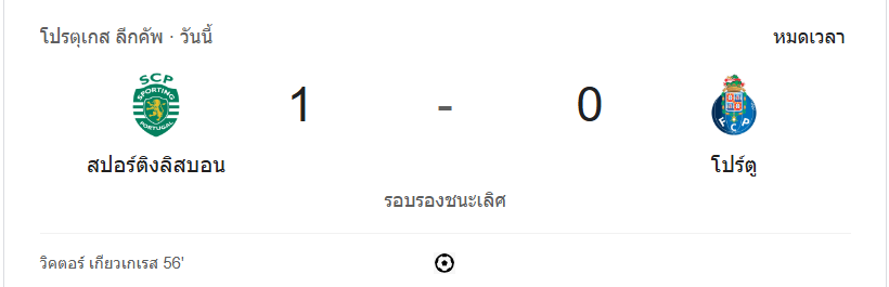 จบเกม: สปอร์ติ้ง ลิสบอน เอาชนะ ปอร์โต้ ด้วยสกอร์ 1-0 จากประตูชัยของ วิคเตอร์ เกียวเกอร์เรส ในนาทีที่ 56