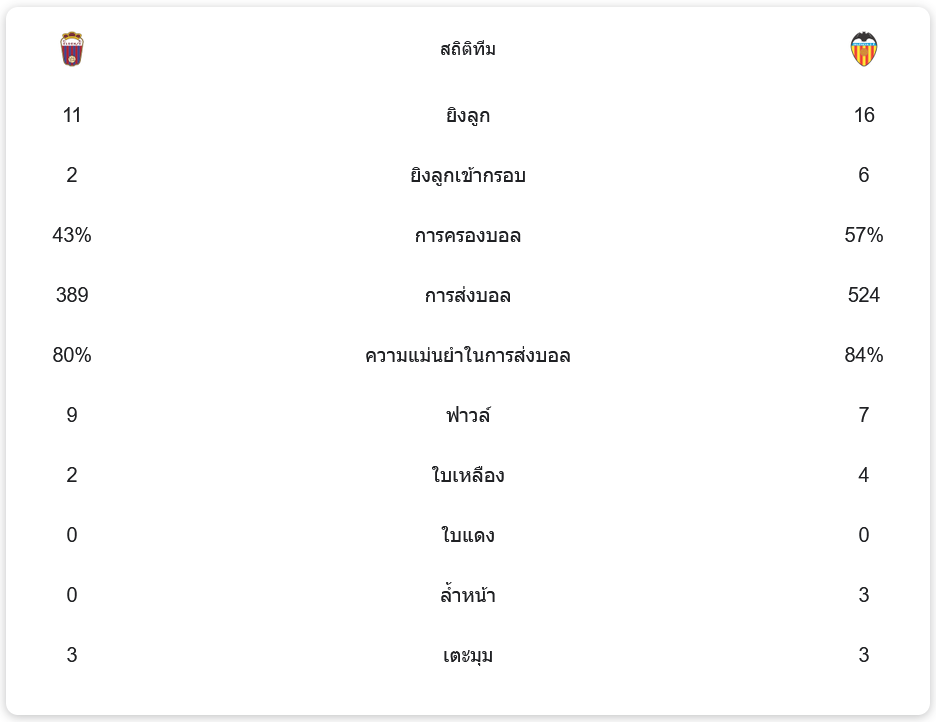 บาเลนเซียครองบอลมากกว่า 57% และมีโอกาสยิง 16 ครั้ง เข้ากรอบ 6 ครั้ง ขณะที่เอลเดนเซ่ครองบอลได้เพียง 43% มีโอกาสยิง 11 ครั้ง แต่ตรงกรอบเพียง 2 ครั้ง ความแม่นยำในการส่งบอลของบาเลนเซียสูงถึง 84% ซึ่งแสดงให้เห็นถึงความมั่นคงในเกมรุก