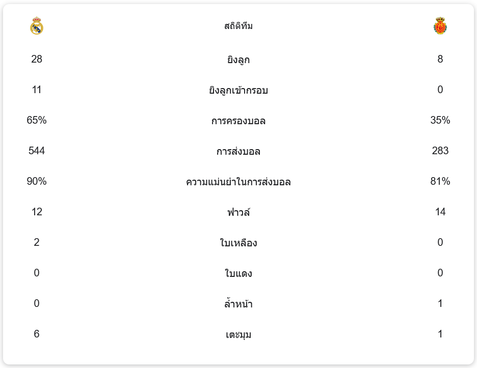 เรอัล มาดริด มีโอกาสยิงมากถึง 28 ครั้ง ครองบอล 65% และผ่านบอลสำเร็จ 90% ในขณะที่มายอร์ก้าทำได้เพียง 8 ครั้งและครองบอลเพียง 35% เกมนี้แสดงให้เห็นถึงความต่างชั้นของทั้งสองทีมอย่างชัดเจน
