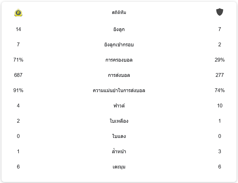 เกมนี้ อันนัศร์ มีโอกาสยิงถึง 14 ครั้ง ครองบอล 71% และจ่ายบอลสำเร็จถึง 91% ส่วนทางอัลอุคดูดมีโอกาสยิงเพียง 7 ครั้ง ครองบอลได้เพียง 29% เกมนี้แสดงให้เห็นถึงความแตกต่างในการควบคุมจังหวะเกมของทั้งสองทีม