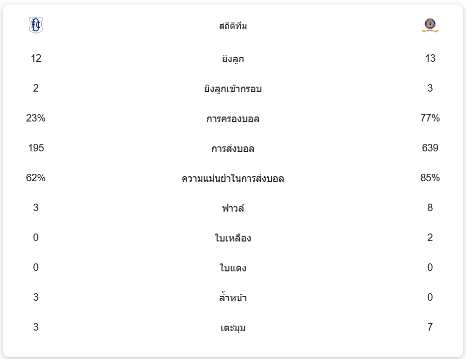 เกมนี้ เรนเจอร์ส มีเปอร์เซ็นต์ครองบอลถึง 77% และจ่ายบอลสำเร็จถึง 85% แต่ทำประตูได้เพียงลูกเดียว ขณะที่ดันดีครองบอลเพียง 23% แต่แสดงให้เห็นถึงเกมรับที่มีวินัย และการใช้โอกาสในการบุกอย่างมีประสิทธิภาพ