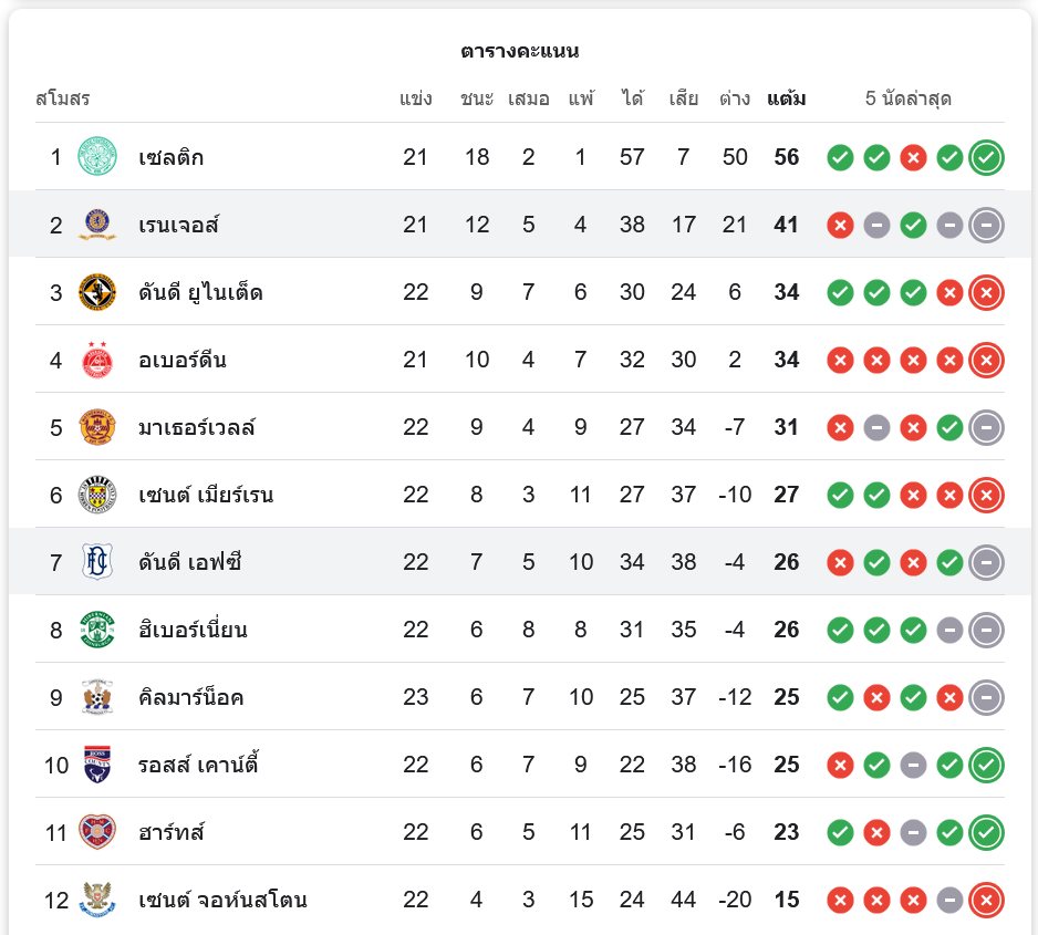 ดันดีอยู่ในอันดับที่ 7 มี 26 คะแนนจาก 22 นัด ส่วนเรนเจอร์สอยู่อันดับ 2 มี 41 คะแนน ยังคงไล่ล่าทีมจ่าฝูงอย่างเซลติกที่นำอยู่ด้วยคะแนน 56