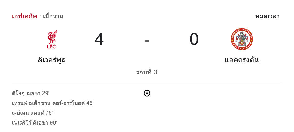 จาก : ผลบอลสด เอฟเอคัพ 2024 ระหว่าง ลิเวอร์พูล 4-0 แอคคริงตัน สแตนลี่ย์ วันนี้ 11/1/68 – บ้านกีฬา