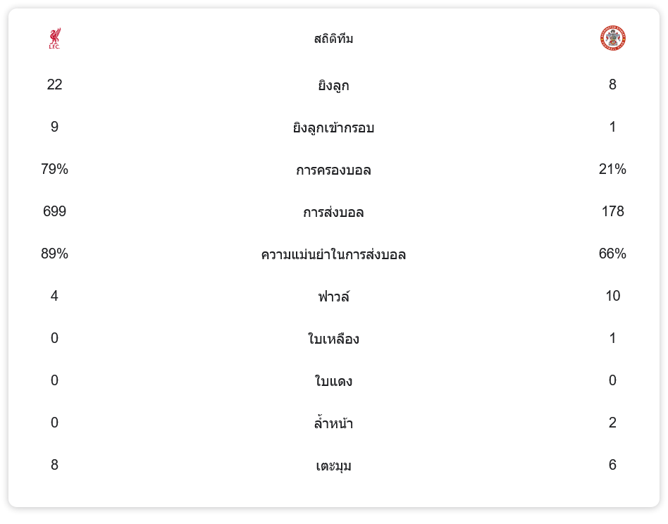 - ลิเวอร์พูล ยิงไป 22 ครั้ง เข้ากรอบ 9 ครั้ง