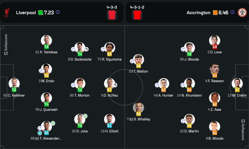 ลิเวอร์พูล มาในแผน 4-3-3 โดยใช้ความเร็วและการบุกที่หลากหลาย เน้นการเจาะเกมรับของแอคคริงตัน ซึ่งมาในแผน 4-3-1-2 ที่พยายามตั้งรับลึกแต่ไม่สามารถต้านทานเกมรุกอันดุดันได้ การส่งบอลแม่นยำ 89% และการครองบอล 79% ชี้ชัดถึงความเหนือกว่าในทุกจังหวะของเกม