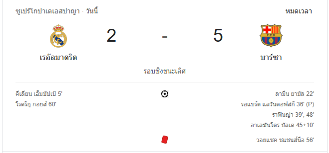 บ้านกีฬา พาคุณติดตามผลบอลสดสุดดุเดือดจากศึก สแปนิช ซูเปอร์ คัพ 2024 ในเกมที่เป็นมากกว่าศึกแห่งศักดิ์ศรี ระหว่าง เรอัล มาดริด และ บาร์เซโลน่า ณ สนามกลางที่เต็มไปด้วยแฟนบอลสุดเร้าใจ เกมนี้กลายเป็นอีกหนึ่งหน้าประวัติศาสตร์ เมื่อบาร์เซโลน่าโชว์ฟอร์มยอดเยี่ยม เอาชนะไปด้วยสกอร์ 5-2 จากการเล่นที่เต็มไปด้วยคุณภาพและจังหวะสำคัญที่ไม่ควรพลาด!
