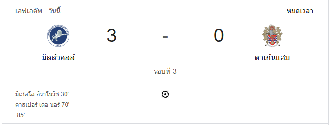 นาทีที่ 94: จบเกม มิลล์วอลล์เอาชนะดาเก้นแฮมไปด้วยสกอร์ 3-0