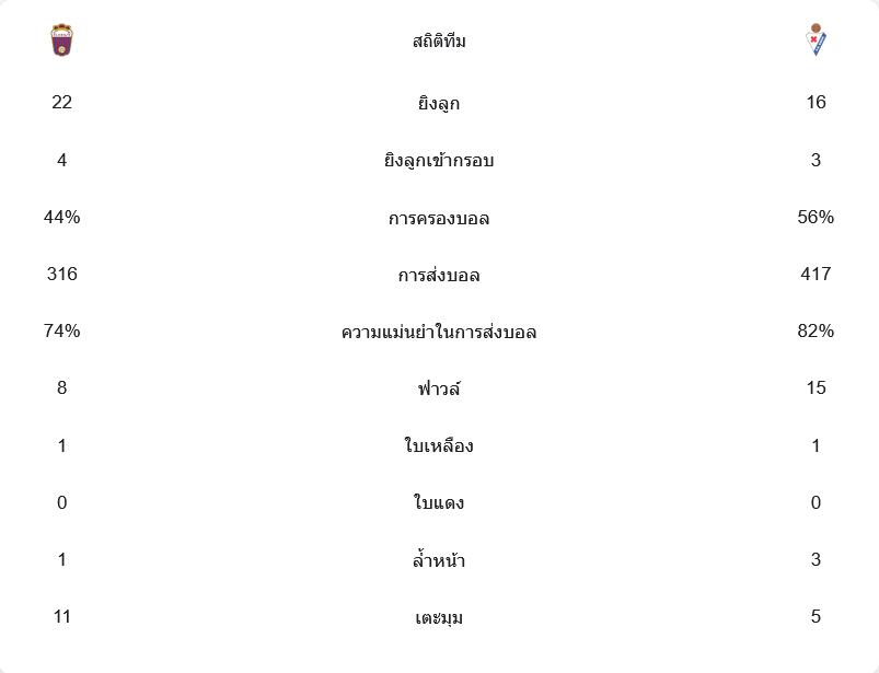 เออิบาร์มีเปอร์เซ็นต์การครองบอลสูงกว่าที่ 56% และจ่ายบอลสำเร็จถึง 417 ครั้ง ขณะที่เอลเดนเซมีโอกาสยิงมากกว่า (22 ครั้ง) แต่เข้ากรอบเพียง 4 ครั้ง ขณะที่เออิบาร์มีโอกาสยิงเข้ากรอบ 3 ครั้งจาก 16 ครั้ง และทำได้ถึง 3 ประตู