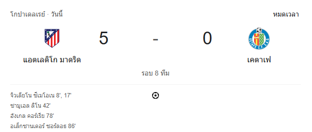 แอตเลติโก มาดริด แสดงให้เห็นถึงความเฉียบคมและพลังเกมรุกที่ดุดัน โดย จูเลียโน่ ซิเมโอเน่ เปิดหัวด้วยสองประตู ก่อนที่ ซามูเอล ลิโน่, อังเคล คอร์เรอา และ อเล็กซานเดอร์ ซอร์ลอธ จะบวกเพิ่มอีกคนละลูก ทำให้พวกเขาเข้าสู่รอบรองชนะเลิศ โกปาเดลเรย์ ได้แบบเหนือชั้น ขณะที่ เคตาเฟ ต้องกลับไปปรับแผนใหม่ หลังพ่ายเละในการเจอกับทีมใหญ่