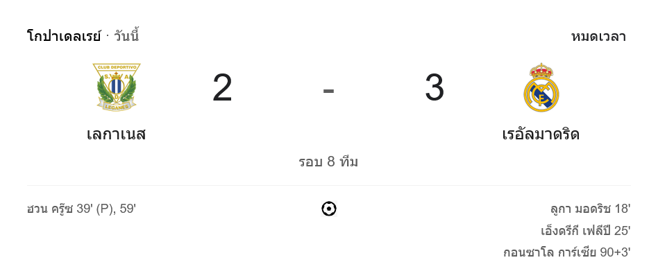 เข้าสู่ครึ่งหลัง เลกาเนสแสดงให้เห็นถึงหัวใจนักสู้ พวกเขาเร่งเครื่องบุกอย่างหนัก จนมาประสบความสำเร็จในนาทีที่ 59 จากจังหวะที่ ฆวน ครูซ คนเดิม โหม่งทำประตูตีเสมอเป็น 2-2 ทำเอากองเชียร์เจ้าบ้านส่งเสียงกระหึ่มทั่วสนาม เกมทำท่าจะจบลงด้วยผลเสมอ แต่แล้วในช่วงทดเวลาบาดเจ็บนาทีที่ 90+3 กอนซาโล่ การ์เซีย กลายเป็นฮีโร่ของราชันชุดขาว ยิงประตูชัยให้เรอัล มาดริด เฉือนชนะไป 3-2 อย่างสุดดราม่า!