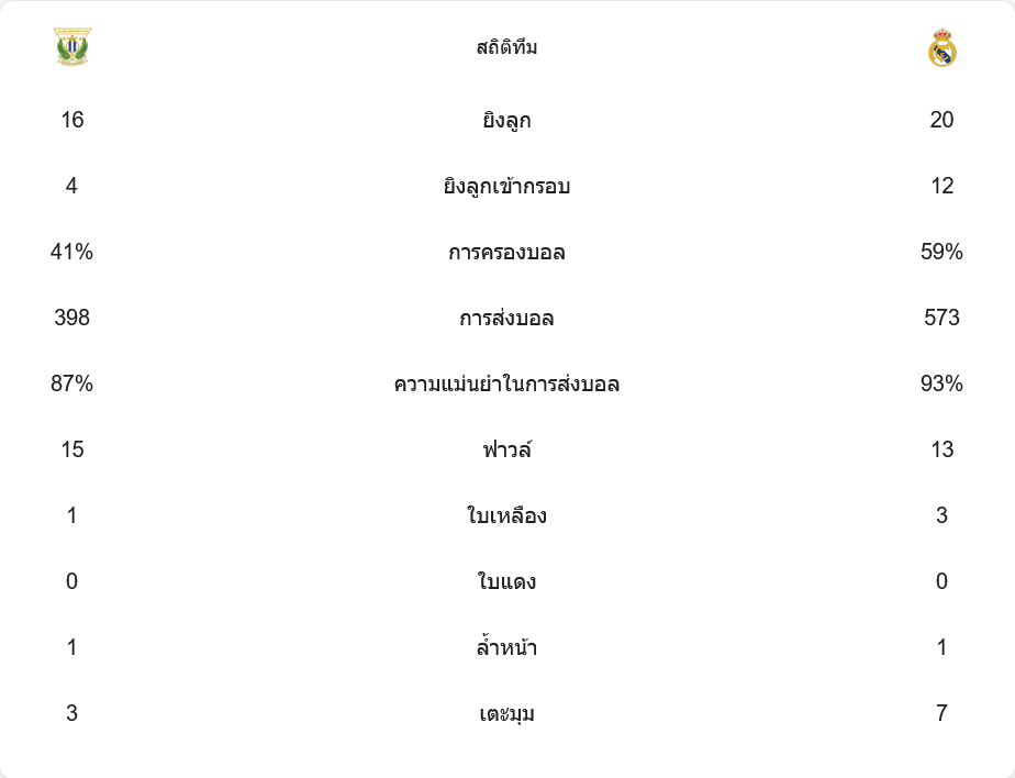 เรอัล มาดริด ครองบอลได้ 59% เหนือกว่าเลกาเนสที่มีเพียง 41% พร้อมโอกาสยิง 20 ครั้ง และยิงเข้ากรอบถึง 12 ครั้ง ขณะที่เลกาเนสมีโอกาสยิง 16 ครั้ง เข้ากรอบ 4 ครั้ง ทั้งสองทีมมีจำนวนฟาวล์ใกล้เคียงกัน แต่เรอัล มาดริดได้เปรียบในเรื่องการสร้างโอกาสและความเฉียบคมในการจบสกอร์