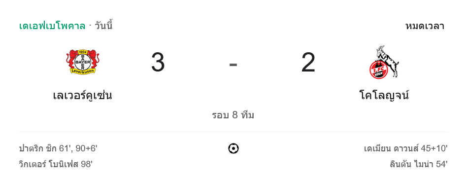 บ้านผลบอล สรุปหลังเกม เลเวอร์คูเซิน พลิกแซง โคโลญจน์ สุดดราม่า 3-2 ลิ่วรอบต่อไปศึกเดเอฟเบโพคาล 2024!