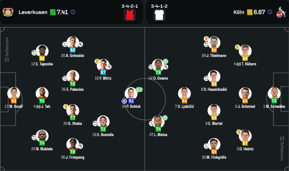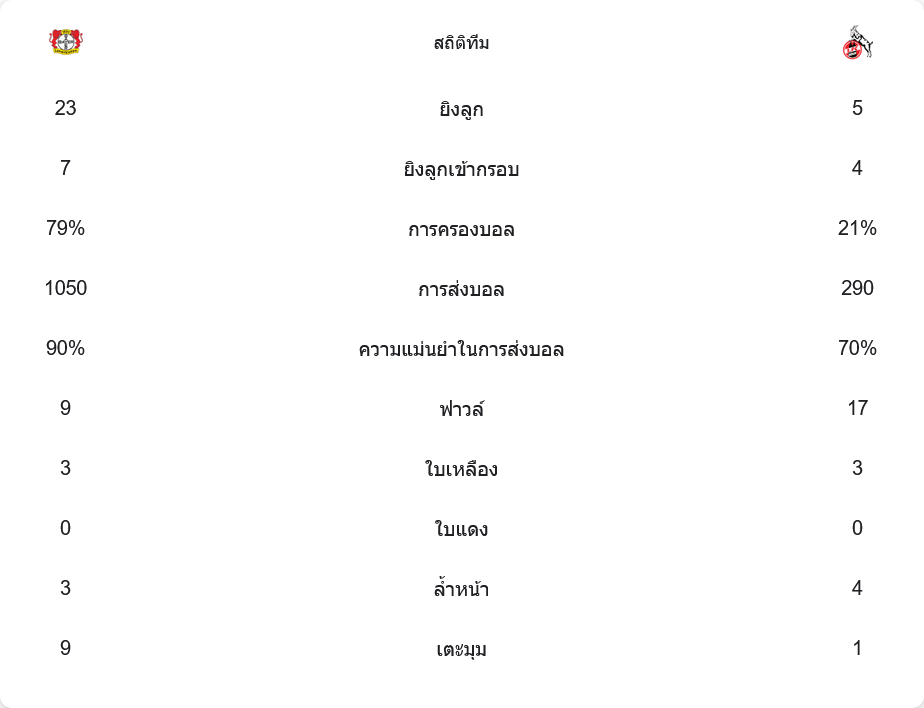 เลเวอร์คูเซินครองบอลได้ถึง 79% พร้อมการผ่านบอลสูงถึง 1,050 ครั้ง และมีความแม่นยำในการส่งบอลถึง 90% พวกเขายิงทั้งหมด 23 ครั้ง เข้ากรอบ 7 ครั้ง ส่วนโคโลญจน์แม้จะครองบอลเพียง 21% แต่ก็สร้างความอันตรายได้จากโอกาสเพียงไม่กี่ครั้ง ยิงทั้งหมด 5 ครั้ง เข้ากรอบ 4 ครั้ง แสดงให้เห็นถึงประสิทธิภาพในการจบสกอร์ที่ไม่ธรรมดา