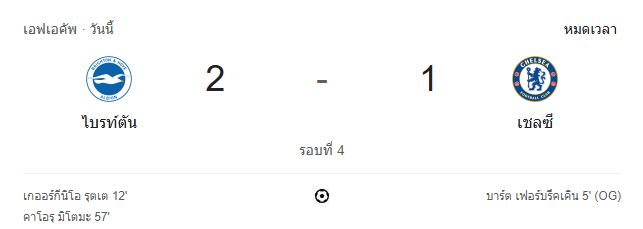 - นาทีที่ 95 กรรมการเป่านกหวีดจบเกม ไบรท์ตันเอาชนะเชลซี 2-1