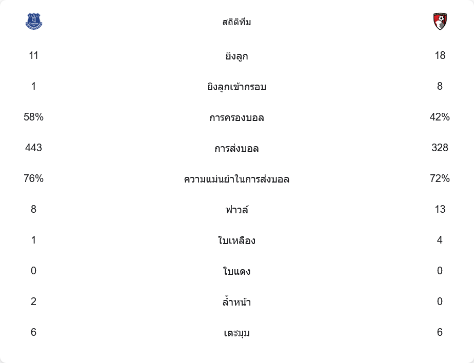 - ลูกเตะมุม เอฟเวอร์ตัน 2 ครั้ง บอร์นมัธ 6 ครั้ง