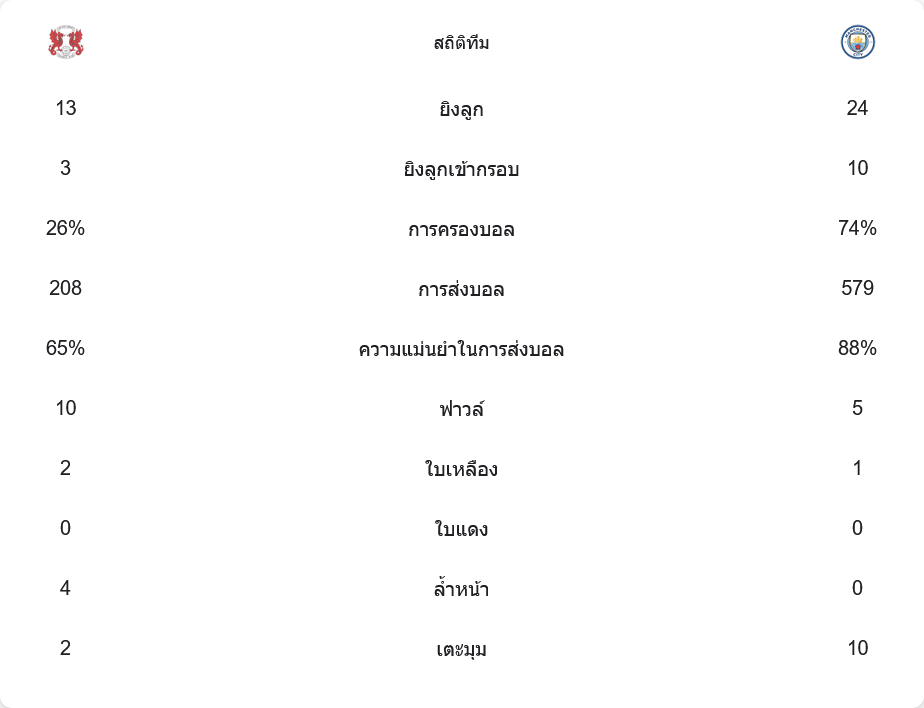 - แมนฯ ซิตี้ ได้เตะมุมมากถึง 10 ครั้ง ขณะที่เจ้าบ้านมีเพียง 2 ครั้ง