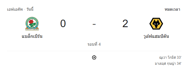 - นาทีที่ 49 กรรมการเป่านกหวีดจบครึ่งแรก แบล็คเบิร์น โรเวอร์ส 0-2 วูล์ฟแฮมป์ตัน