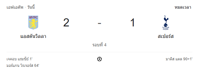บ้านกีฬา พาคุณมาเกาะติดศึก เอฟเอ คัพ 2024 รอบที่ 4 ซึ่งเป็นเกมสุดเข้มข้นระหว่าง แอสตัน วิลล่า เปิดรัง วิลล่า พาร์ค ต้อนรับการมาเยือนของ ท็อตแน่ม ฮ็อทสเปอร์ ทั้งสองทีมต่างต้องการชัยชนะเพื่อผ่านเข้าสู่รอบต่อไป ทำให้เกมนี้เต็มไปด้วยจังหวะปะทะและการเข้าทำที่รวดเร็ว วิลล่า ได้ประตูขึ้นนำเร็วตั้งแต่นาทีแรก ก่อนที่ โรเจอร์ส จะบวกเพิ่มในครึ่งหลัง ขณะที่ สเปอร์ส มาตีไข่แตกได้ในช่วงทดเวลาบาดเจ็บ แต่ไม่เพียงพอ ส่งผลให้ วิลล่า เป็นฝ่ายเข้ารอบไปได้อย่างสุดมันส์