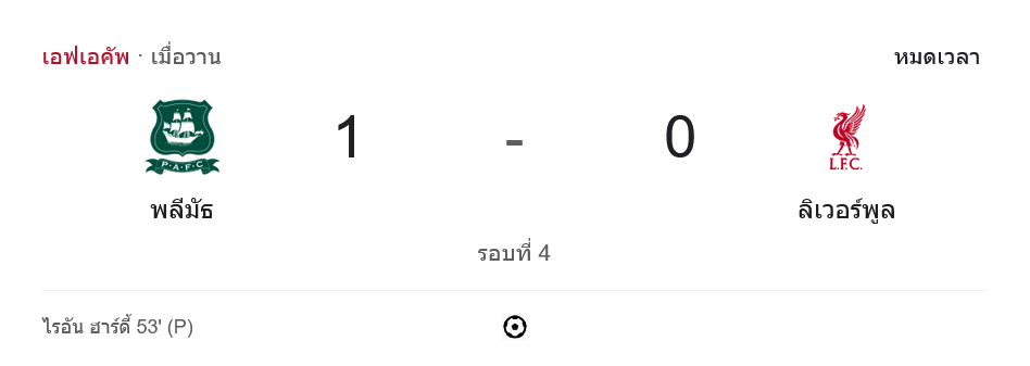 ศึก เอฟเอ คัพ 2024 รอบที่ 4 เกิดเหตุการณ์ช็อกแฟนบอลทั่วโลกเมื่อ พลีมัธ อาร์ไกล์ จากแชมเปี้ยนชิพเปิดบ้านพลิกล็อกเอาชนะ ลิเวอร์พูล 1-0 ทะลุเข้าสู่รอบต่อไปได้อย่างสุดยอด แม้ว่าหงส์แดงจะครองบอลได้มากกว่า แต่เกมรับที่เหนียวแน่นของเจ้าถิ่นและประตูชัยจากจุดโทษของ ไรอัน ฮาร์ดี้ ก็เพียงพอให้พวกเขาเขี่ยทีมยักษ์ใหญ่ตกรอบ บ้านกีฬา ขอสรุป ผลบอลสด และเหตุการณ์สำคัญในเกมให้แฟนบอลทุกคนได้ติดตาม