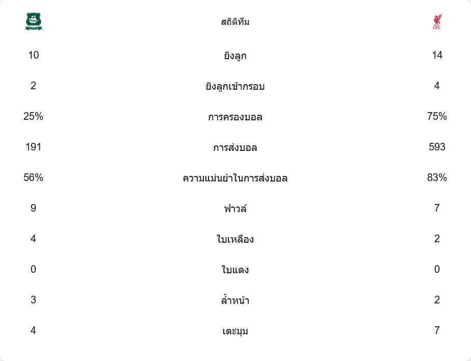 ลิเวอร์พูลครองบอลได้มากกว่าชัดเจน (75%) และมีโอกาสยิงมากกว่า (14 ต่อ 10 ครั้ง) แต่พลีมัธเล่นเกมรับได้อย่างเหนียวแน่น และมีความเด็ดขาดกว่าในจังหวะสำคัญ ทำให้พวกเขาสามารถคว้าชัยชนะไปครองได้