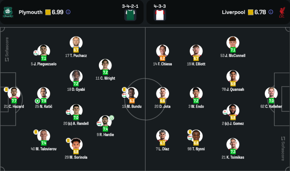 ⭐ นิโคลา คาติช (7.9/10) – กองหลังของพลีมัธโชว์ฟอร์มสุดแกร่ง ป้องกันแนวรุกลิเวอร์พูลได้ดีเยี่ยม และเป็นหัวใจสำคัญของเกมรับในแมตช์นี้