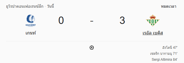 - นาทีที่ 47 กรรมการเป่านกหวีดจบครึ่งแรก KAA เกนท์ 0-0 เรอัล เบติส