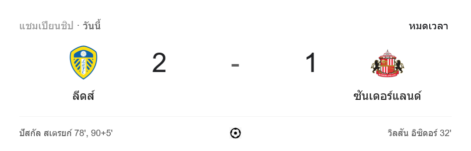 เกมดูเหมือนจะจบด้วยการแบ่งแต้ม แต่แล้วในช่วงทดเวลาบาดเจ็บ นาทีที่ 90+5 ลีดส์ มาได้ประตูชัยจาก ปาสกาล สตรูย์ค คนเดิม ยิงประตูสำคัญให้เจ้าบ้านคว้าชัยสุดดราม่า จบเกม ลีดส์ ยูไนเต็ด พลิกชนะ ซันเดอร์แลนด์ 2-1