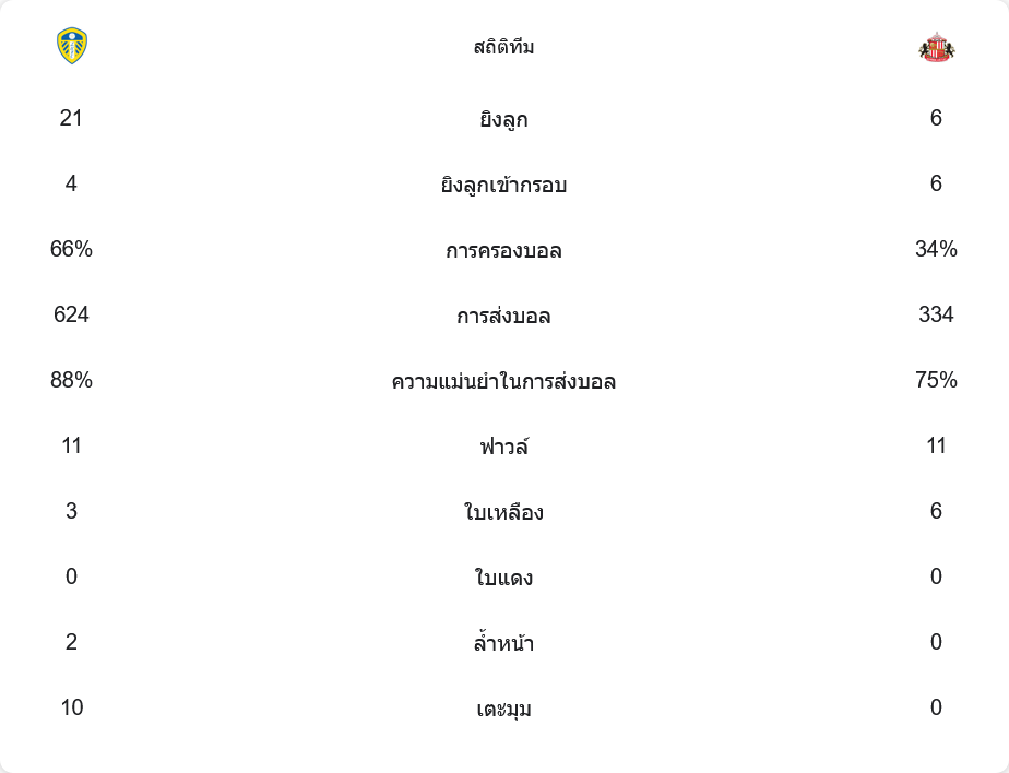 - ลีดส์ ครองบอล 66% ซันเดอร์แลนด์ 34%