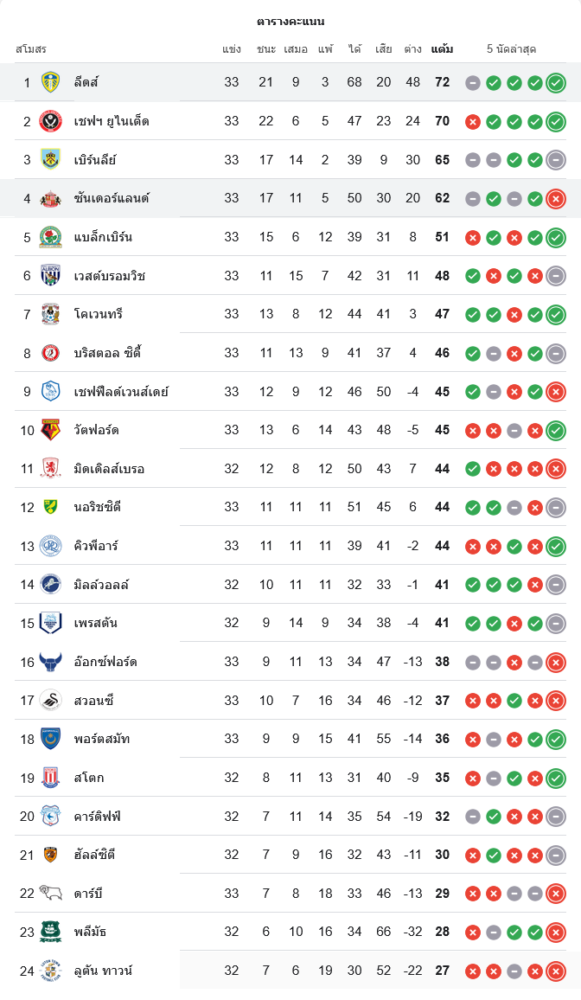 ในโปรแกรม ตารางบอล นัดถัดไป ลีดส์ ยูไนเต็ด จะต้องเจอกับ เชฟฟิลด์ ยูไนเต็ด ทีมอันดับสอง ซึ่งเป็นเกมสำคัญของการลุ้นแชมป์ ขณะที่ ซันเดอร์แลนด์ จะเจอกับ ฮัลล์ ซิตี้ ที่ต้องการแต้มเพื่อขยับขึ้นไปอยู่ในโซนเพลย์ออฟ
