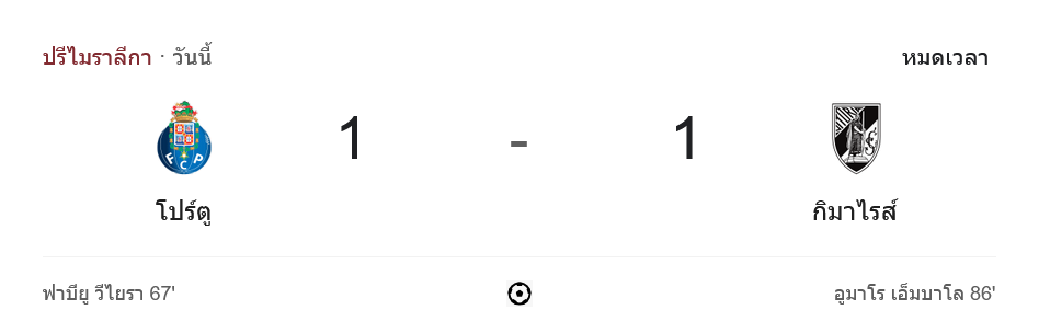ศึก ปรีไมราลีกา 2024 นัดสำคัญที่สนามเอสตาดิโอ โด ดราเกา เจ้าถิ่น ปอร์โต้ พลาดท่าในช่วงท้ายเกม ถูก วิตอเรีย กิมาไรส์ ตามตีเสมอ 1-1 แบ่งแต้มไปแบบสุดดราม่า เกมนี้เจ้าบ้านเป็นฝ่ายคุมเกมและได้ประตูขึ้นนำก่อนจาก ฟาบิโอ วิเอร่า นาทีที่ 67 แต่กลับถูกทีมเยือนตีเสมอช่วงท้ายเกมจาก อูมาโร เอ็มบาลอ นาทีที่ 86 ทำให้ทั้งสองทีมต้องจบเกมด้วยผลเสมอ ส่งผลต่อการลุ้นแชมป์อย่างจัง โดยผลการแข่งขันนี้สะท้อนความเข้มข้นของเกมที่มีการเข้าปะทะกันดุเดือดและมีจังหวะพลิกเกมตลอด 90 นาที