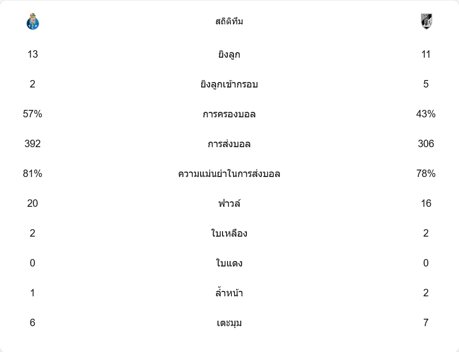 ปอร์โต้เหนือกว่าทั้งการครองบอล (57%) และการจ่ายบอล (392 ครั้ง) เทียบกับกิมาไรส์ (306 ครั้ง) แต่โอกาสจบสกอร์ของทีมเยือนกลับทำได้ดีกว่า โดยกิมาไรส์มีโอกาสยิงเข้ากรอบมากกว่า (5 ครั้ง เทียบกับปอร์โต้ 2 ครั้ง)