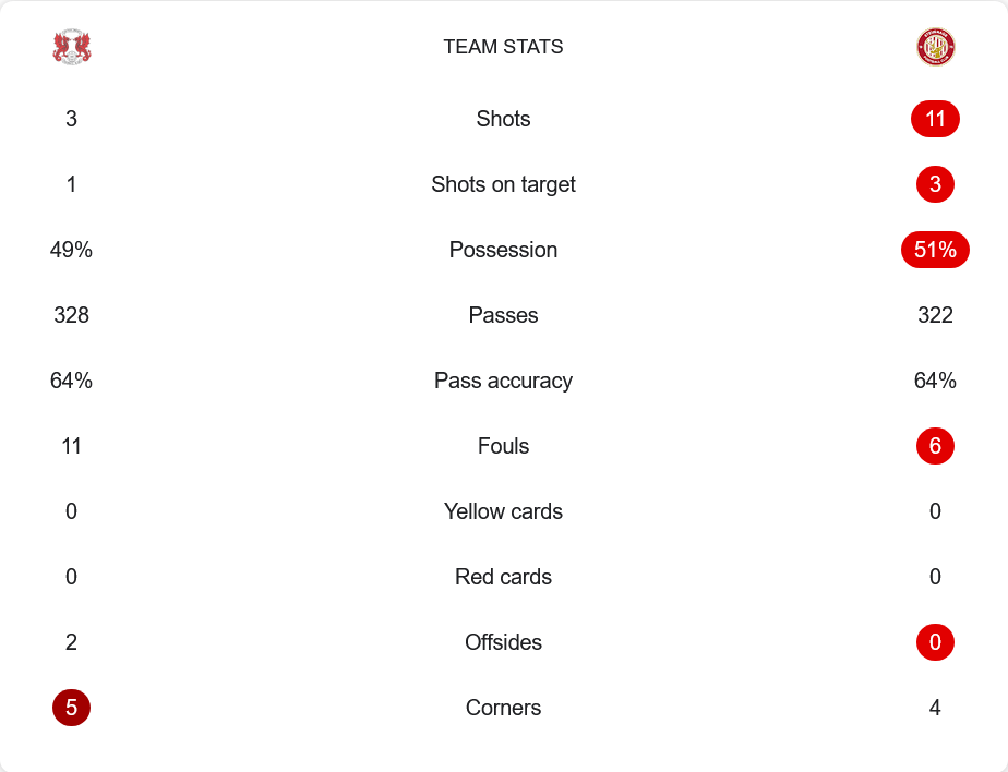 แม้เกมนี้ สตีฟเนจ จะครองบอลมากกว่าเล็กน้อยที่ 51% ต่อ 49% แต่เลย์ตัน โอเรียนท์ ใช้โอกาสเพียงน้อยนิดได้อย่างมีประสิทธิภาพ โดยยิงเพียง 3 ครั้ง และเข้ากรอบ 1 ครั้งก็กลายเป็นประตูชัย ในขณะที่ทีมเยือนมีโอกาสถึง 11 ครั้ง ยิงเข้ากรอบ 3 ครั้ง แต่กลับไร้สกอร์ นอกจากนี้ จำนวนการจ่ายบอลของทั้งสองทีมใกล้เคียงกัน (โอเรียนท์ 328 ครั้ง, สตีฟเนจ 322 ครั้ง) ด้วยความแม่นยำเพียง 64% เท่ากัน ขณะที่เลย์ตัน โอเรียนท์ฟาวล์มากกว่าถึง 11 ครั้ง เทียบกับสตีฟเนจที่มีเพียง 6 ฟาวล์ แต่ทั้งสองทีมไม่มีใบเหลืองหรือใบแดงแต่อย่างใด