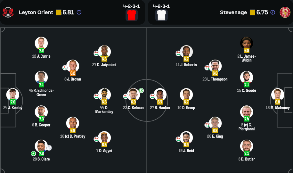 ด้าน สตีฟเนจ มาในระบบเดียวกันคือ 4-2-3-1 แต่รูปแบบการเติมเกมรุกเน้นการต่อบอลสั้นจากแดนกลาง และขยับผู้เล่นเข้าทำเป็นกลุ่ม โดยมี รีด และโรเบิร์ตส์ เป็นแกนหลักในการสร้างสรรค์เกม อย่างไรก็ตาม แม้จะครองบอลได้มากกว่าเล็กน้อย แต่ความแม่นยำในจังหวะจบสกอร์ยังไม่เฉียบคมพอ เกมนี้จึงสะท้อนชัดเจนว่าทั้งสองทีมมีสไตล์การเล่นใกล้เคียงกัน แต่เลย์ตัน โอเรียนท์จบสกอร์ได้คมกว่าในจังหวะที่จำเป็น และจากมุมมอง วิเคราะห์บอล แล้ว พวกเขาสมควรเป็นผู้ชนะในเกมนี้
