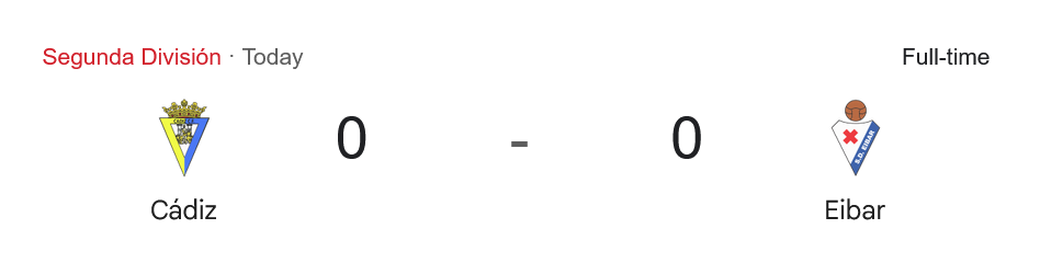 ท้ายเกมยังคงเป็นการต่อสู้ที่ไม่มีใครยอมใคร เออิบาร์ พยายามบุกเพื่อทำประตู แต่ไม่สามารถเจาะแนวรับของ กาดิซ ได้ จบเกมที่สกอร์ 0-0 แบบไร้การทำประตู