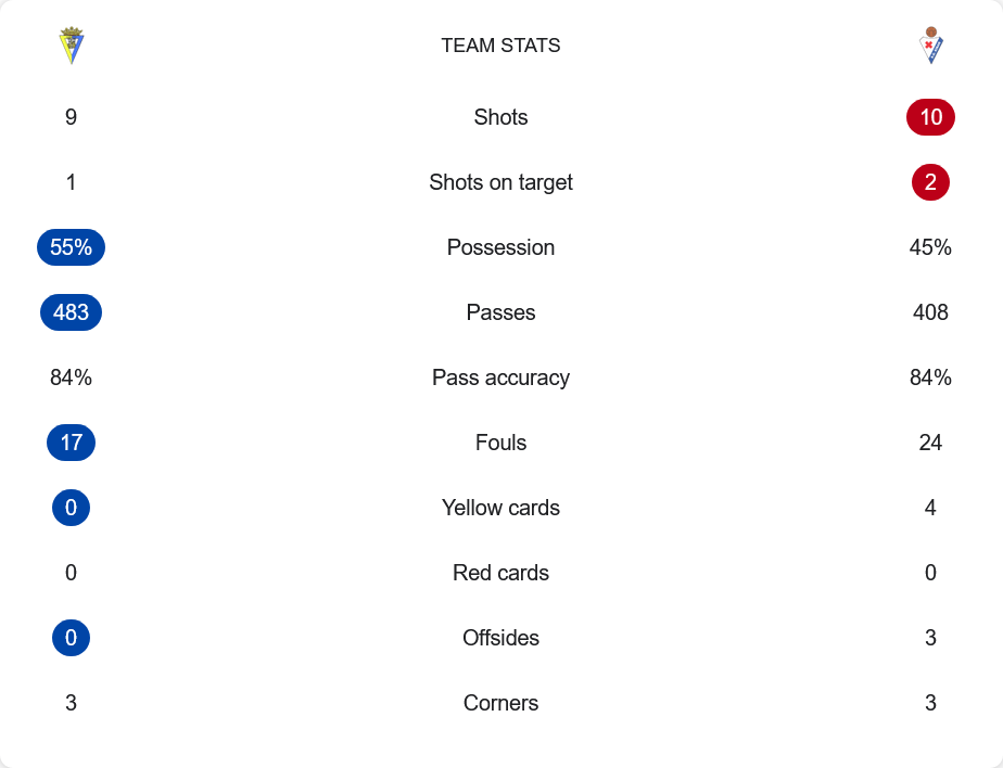 อย่างไรก็ตาม แม้ กาดิซ จะครองบอลได้มากกว่า แต่จำนวนการยิงประตูของพวกเขาทำได้เพียง 9 ครั้ง โดยมีแค่ 1 ครั้งเท่านั้นที่เข้ากรอบ ในขณะที่ทีมเยือน เออิบาร์ มีโอกาสยิงทั้งหมด 10 ครั้ง และสามารถยิงเข้ากรอบได้ 2 ครั้ง แสดงให้เห็นถึงประสิทธิภาพที่ดีกว่าในด้านการจบสกอร์