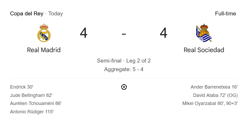 จาก : ผลบอลสดโกปาเดลเรย์ 2025 ระหว่าง เรอัล มาดริด 4-4 เรอัล โซเซียดาด วันนี้ 2/4/68 – บ้านกีฬา