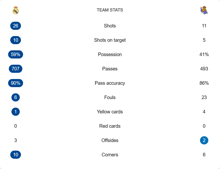 เรอัล มาดริด ครองเกมได้อย่างชัดเจนด้วยการยิง 26 ครั้ง โดยเข้ากรอบ 10 ครั้ง ขณะที่ เรอัล โซเซียดาด มีโอกาสยิงเพียง 11 ครั้ง โดยเข้ากรอบ 5 ครั้ง ทั้งสองทีมต่างสร้างโอกาสได้อย่างน่าประทับใจ แต่ความแม่นยำและความดุดันของ เรอัล มาดริด ที่มากกว่า ทำให้พวกเขาสามารถคว้าชัยไปได้ในที่สุด