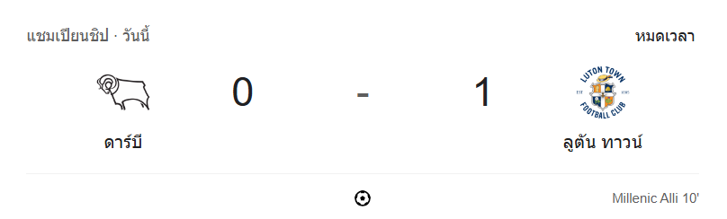 - จบการแข่งขัน: ลูตัน ทาวน์ บุกชนะ ดาร์บี้ เค้าท์ตี้ 1-0 เก็บสามแต้มแบบเด็ดขาด