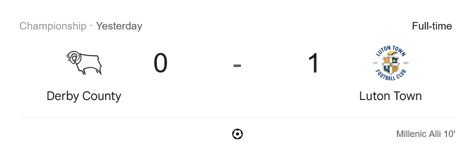 จาก : ผลบอลสด อีเอฟแอลแชมเปียนชิป 2025 ระหว่าง ดาร์บี้ เค้าท์ตี้ 0-1 ลูตัน ทาวน์ วันนี้ 18/4/68 – บ้านกีฬา