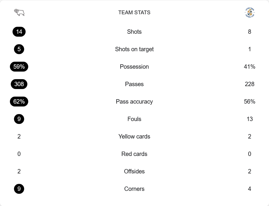 แม้ดาร์บี้ เค้าท์ตี้จะครองบอลได้มากกว่าถึง 59% และสร้างโอกาสยิงได้ 14 ครั้ง โดยมี 5 ครั้งตรงกรอบ แต่พวกเขากลับไร้ประตู ขณะที่ลูตัน ทาวน์มีโอกาสยิงเพียง 8 ครั้ง เข้ากรอบแค่ครั้งเดียว และกลายเป็นประตูสำคัญตั้งแต่นาทีที่ 10 ดาร์บี้ผ่านบอลได้ 308 ครั้ง ด้วยความแม่นยำ 62% ส่วนลูตันผ่านบอล 228 ครั้ง ความแม่นยำ 56% ด้านการทำฟาวล์ ดาร์บี้ทำ 9 ครั้ง ลูตัน 13 ครั้ง ทั้งสองทีมได้ใบเหลืองฝั่งละ 2 ใบ การเตะมุม ดาร์บี้เหนือกว่าที่ 9 ครั้งต่อลูตัน 4 ครั้ง แต่ไร้ประสิทธิภาพจบสกอร์
