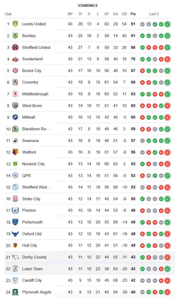 ชัยชนะนัดนี้ทำให้ ลูตัน ทาวน์ มีเพิ่มเป็น 43 คะแนน เท่ากับดาร์บี้ เค้าท์ตี้ แต่ลูกได้เสียยังเป็นรองจึงรั้งอันดับ 22 ของตาราง ขณะที่ดาร์บี้ยังคงอยู่อันดับ 21 ด้วยคะแนนเท่ากัน โดยการหนีตกชั้นในช่วงโค้งสุดท้ายนี้กำลังเข้มข้นสุดขีด