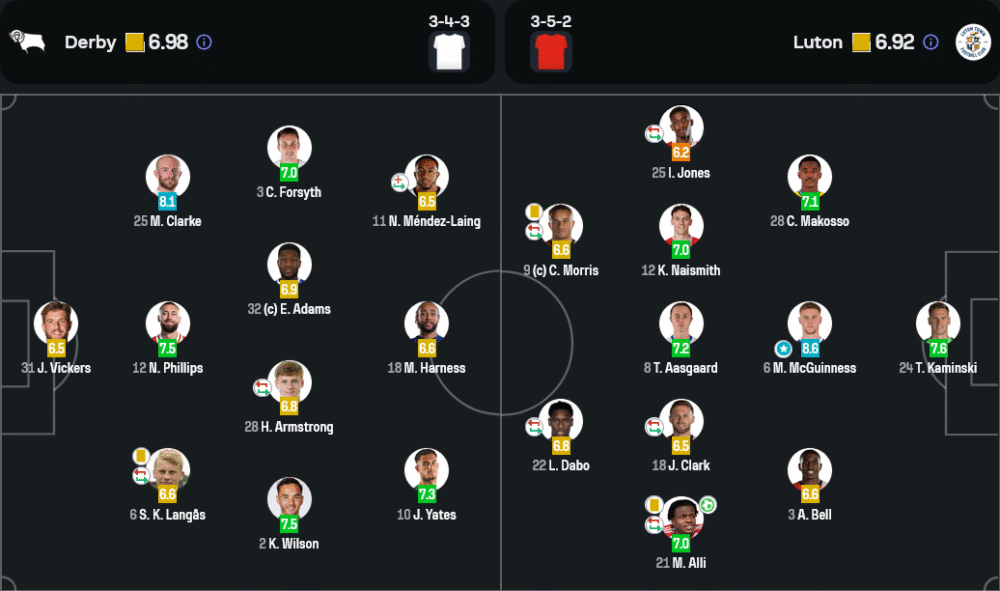 ฝั่งลูตัน ทาวน์มาในระบบ 3-5-2 แบบรัดกุม เกมรับเหนียวแน่นและเน้นสวนกลับเร็ว การวิเคราะห์บอลเห็นชัดว่าแผนรับลึกของลูตันได้ผลเต็มที่ โดยมี มาร์ค แมคกินเนส เป็นหัวใจสำคัญของแนวรับ ทั้งการอ่านเกม สกัดบอล และลูกกลางอากาศ จนสามารถต้านเกมรุกของดาร์บี้ได้ตลอดทั้ง 90 นาที