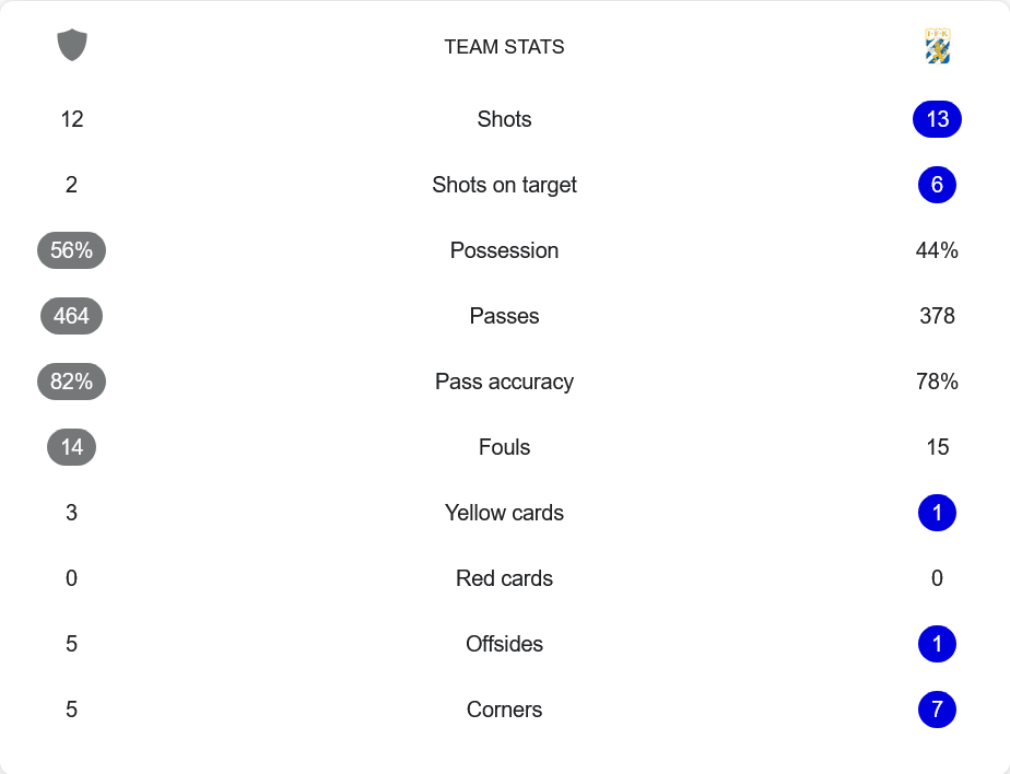 แม้เดเกอร์ฟอร์สจะได้เปรียบในการครองบอล (56%) และจำนวนผ่านบอลที่สูงกว่า แต่จังหวะจบสกอร์เป็นของโกเตบอร์กที่เฉียบคมกว่า ชัดเจนจากการยิงทั้งหมด 13 ครั้ง เข้ากรอบถึง 6 ส่วนเดเกอร์ฟอร์สได้ยิง 12 ครั้ง เข้ากรอบแค่ 2 หน โอกาสทำประตูจึงต่างกันชัดเจน ฟาวล์รวมทั้งสองทีมสูงถึง 29 ครั้ง เกมนี้เดเกอร์ฟอร์สได้เตะมุม 5 ครั้ง โกเตบอร์กได้มากกว่า 7 ครั้ง ทั้งยังเสียใบเหลืองคนละ 3 และ 1 ใบ บรรยากาศในสนามตึงเครียดและเข้มข้นตั้งแต่ต้นจนจบเกม