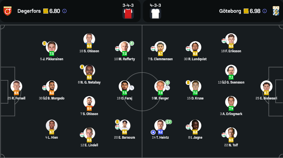 ฝั่งโกเตบอร์กของ Stefan Billborn วางแผนบุกเต็มรูปแบบ 4-3-3 อาศัยความเร็วของปีกซ้าย-ขวา และการประสานงานระหว่าง Tobias Heintz กับ Max Fenger ที่เล่นกันรู้ใจ สร้างโอกาสจบสกอร์ได้หลากหลาย การรับส่งบอลอาจแม่นยำน้อยกว่าเดเกอร์ฟอร์ส (ผ่านบอล 378 ครั้ง, แม่นยำ 78%) แต่ทุกครั้งที่พาบอลเข้าเขตโทษมักจบเป็นโอกาสยิงทันที การเล่นเกมรับแม้จะครองบอลน้อยแต่ยืนระยะได้อย่างมั่นใจ บีบพื้นที่เจ้าถิ่นไม่ให้ทำเกมรุกเข้ามาถึงพื้นที่อันตรายบ่อยนัก