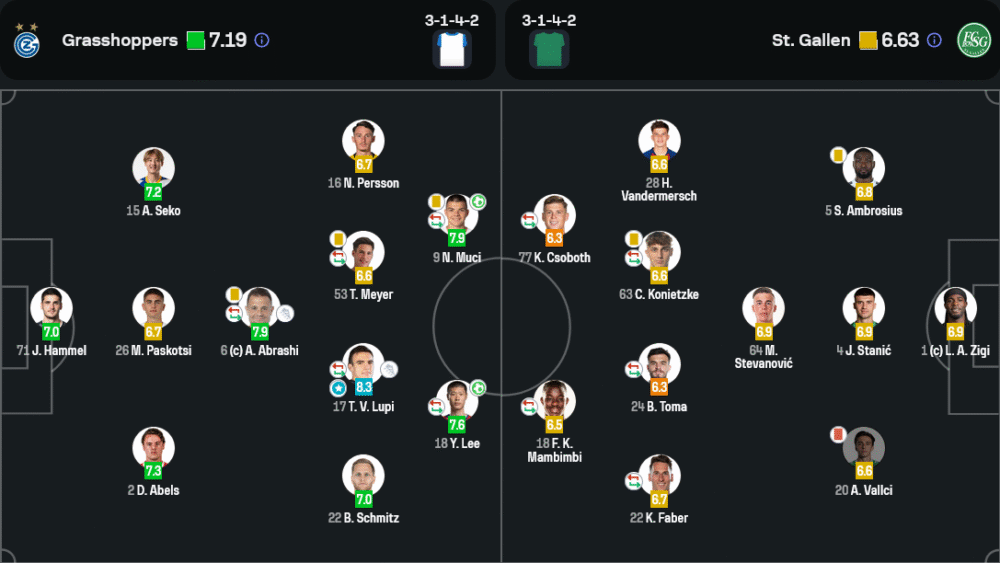 แม้กราสฮ็อปเปอร์จะครองบอลเพียง 46% แต่พวกเขากลับมีโอกาสยิงมากถึง 21 ครั้ง โดย 5 ครั้งเข้ากรอบ และได้เตะมุมถึง 10 หน ขณะที่เซนต์ กัลเลนครองบอล 54% จ่ายบอล 379 ครั้งเทียบกับเจ้าบ้าน 312 ครั้ง โดยทั้งสองทีมมีความแม่นยำในการจ่ายเท่ากันที่ 72% แต่สิ่งที่ต่างคือการจบสกอร์ โดยทีมเยือนยิงเพียง 6 ครั้ง และเข้ากรอบแค่หนเดียว นอกจากนี้พวกเขายังฟาวล์ถึง 13 ครั้ง เสียใบเหลือง 3 ใบ และโดนใบแดง 1 ใบ ส่วนกราสฮ็อปเปอร์ฟาวล์ 9 ครั้ง และไม่มีผู้เล่นถูกไล่ออก